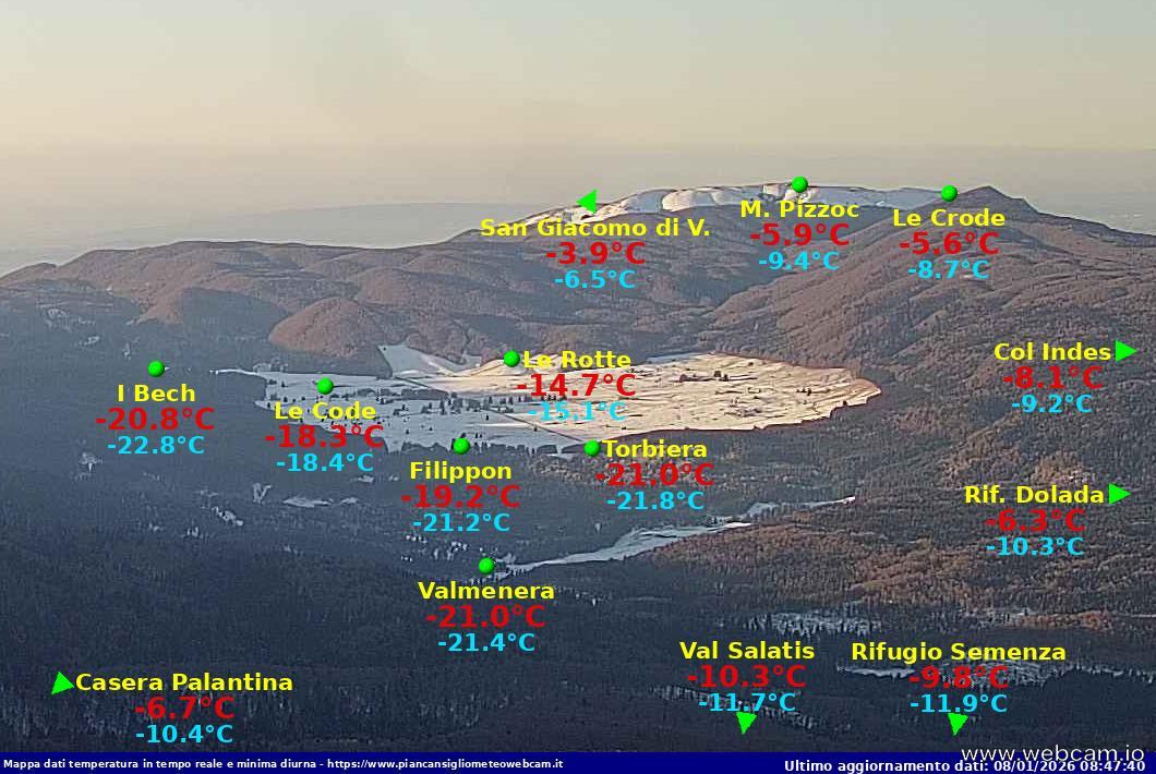Alle ore 08:51 del 08 gennaio 2026, il quadro delle temperature minime giornaliere mostra valori molto bassi, con punte inferiori ai –22 °C nelle aree più soggette a forte inversione termica, come I Bech e Pian di Valmenera, e valori prossimi o inferiori ai –20 °C in diverse località dell’altopiano. Si vedano I dati qui https://opendata.piancansigliometeowebcam.it/sinottico/estremi_stazioni_completo.php e su Grafana https://stazioni.piancansigliometeowebcam.it/d/cf56d8ac-8bdf-4a4e-b434-af499d0d53d4/e08413e